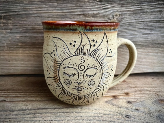 Przyjemnie okrągły, kamionkowy kubek Słońce na dużą jesienną herbatę